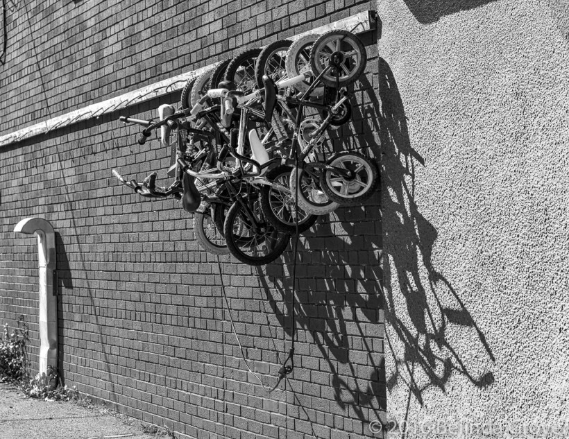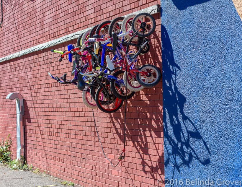 A neighbourhood bike shop got creative. The bikes suspended from the colourful wall look like a wonderful piece of art. A simple idea yet full of imagination. The owner even took precautions against theft as the bikes are locked into place. I liked the vibrant colours but with all the detail and texture in the wall I thought the photo would work in black and white as well.