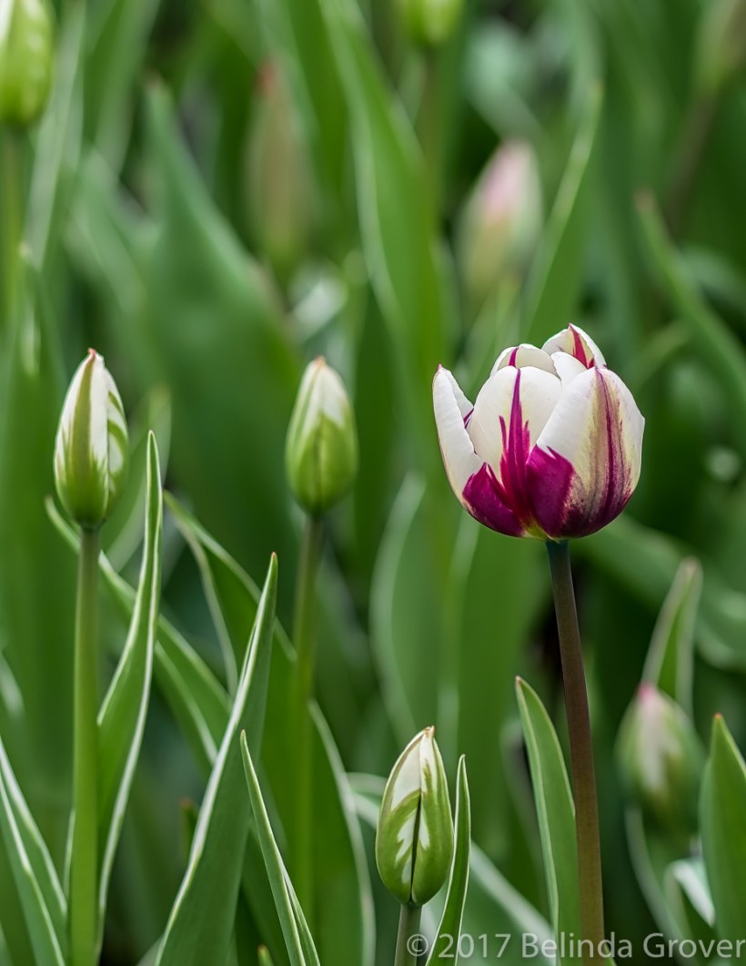 Beautiful shots, Belinda. Lovely composition in the first one with the promise of the unopened blossoms and the striking magenta striped tulip surrounded by all that green! The second one is wonderful, too, with the detail and focus on that one bloom. And what a color symphony after the dull cold winter and spring you have had.