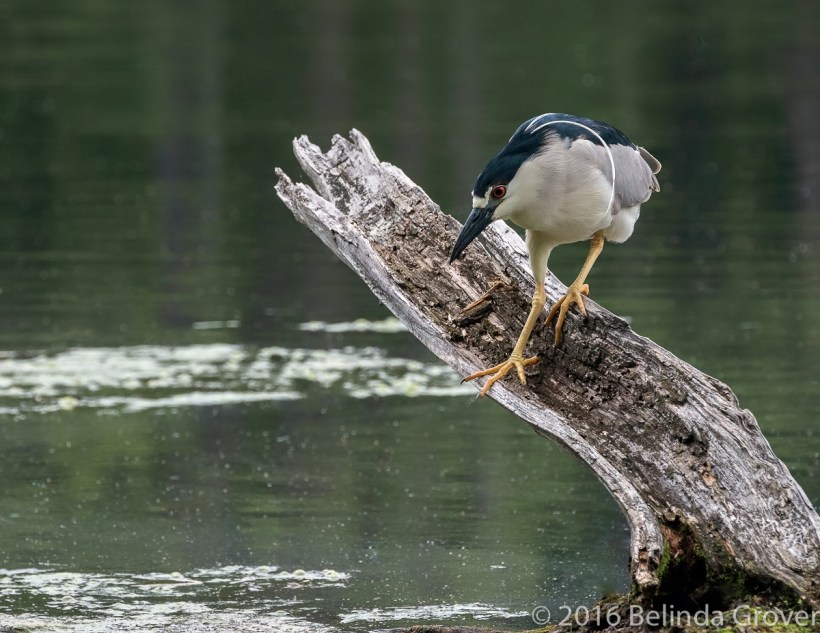 This black-crowned night heron is in mating plumage, sporting two long white plumes. Both sexes look alike (at least to me) but I believe this is a male given its larger size.