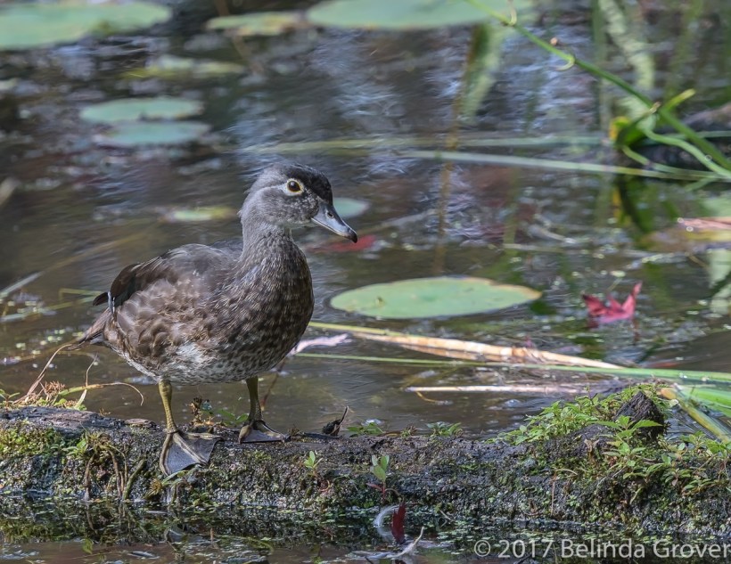 Love that she is out of the water on that earthy log and your shot includes her feet. We don’t see that too often in Wood Ducks–usually it’s their butts as they swim away! Very nice!