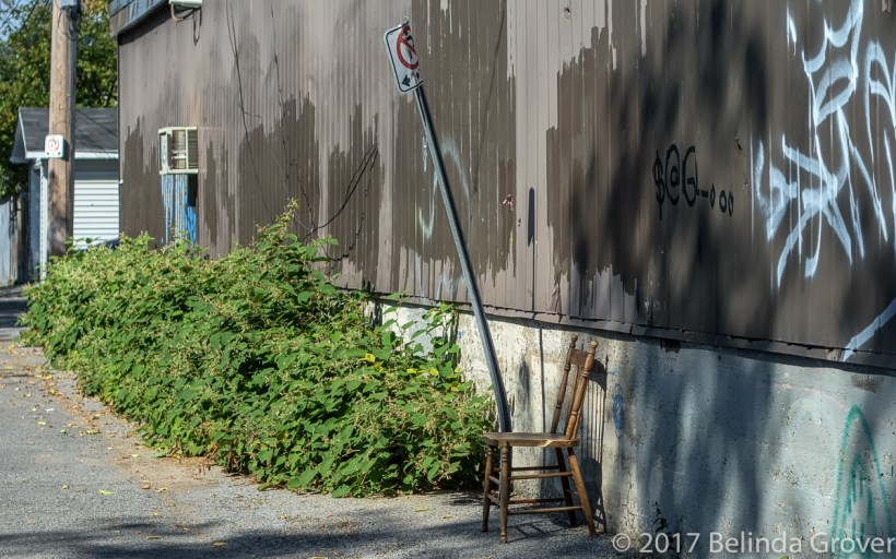 I enjoy turning off a city street when I notice a laneway. A few of the city’s older commercial/residential neighbourhoods have some interesting lanes to explore. The chair under the No Parking sign looked out of place in this setting. Perhaps it was placed there years ago but it looked as though it was still used by someone…