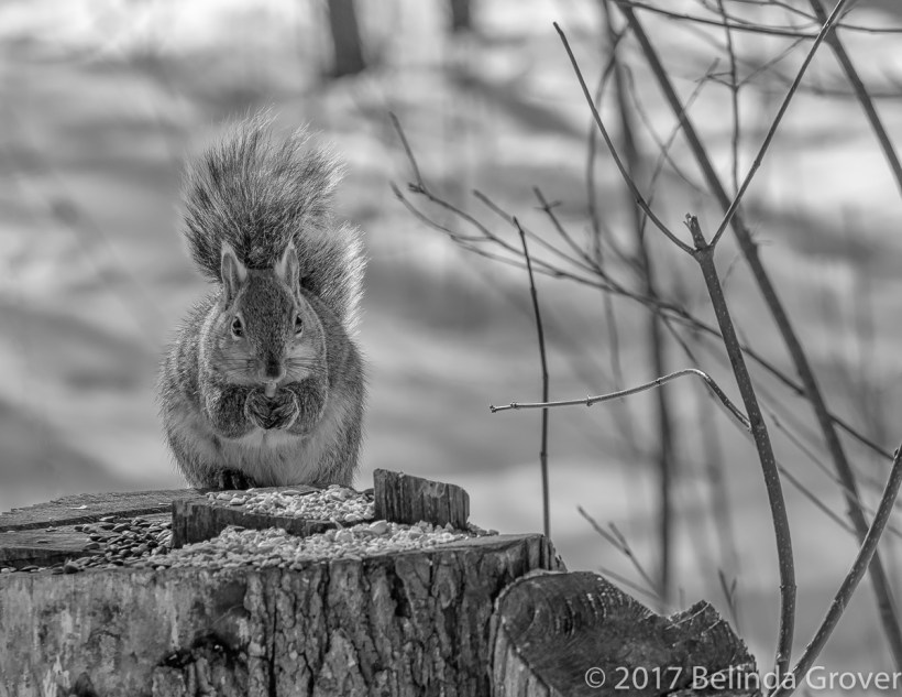 Very nice, Belinda! That’s a great squirrel pose on his table! I like the color one better too, with the snow casting that nearly spring blue look.