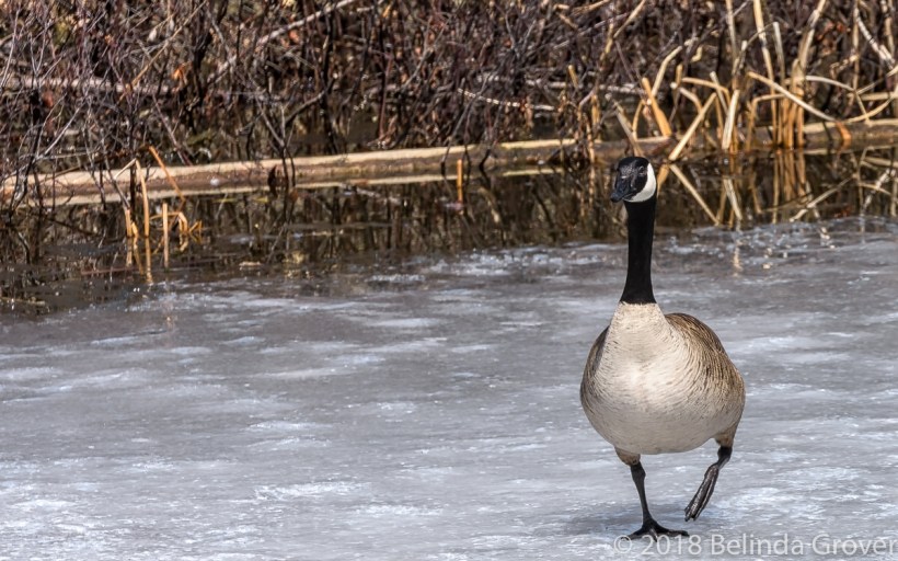 We stopped by a reserve today hoping for a few signs of Spring. This is what it looks like in my corner of the world! This Canada Goose must have been wondering what was going on… The ice is beginning to recede on the lake but we need some +C temperatures to help things along. No snow drops or wild violets yet but we did see a few wood ducks in the open water and a pileated woodpecker starting a nest, sure signs of spring!