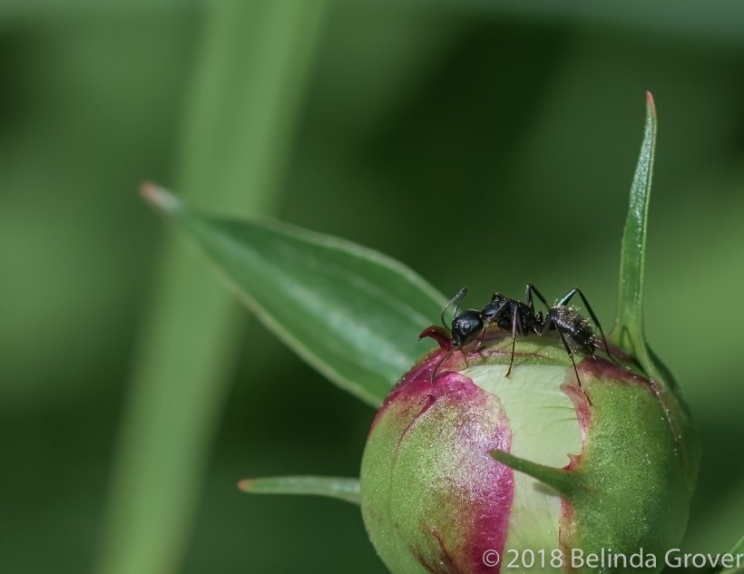 A walk in my downtown neighbourhood is always interesting. It’s a mix of old and new homes and apartments many of which have tiny gardens. Although most of the peonies are beginning to fade, this particular bush has not yet come into flower and I focused on this ant as it ran in circles. I increased the shutter speed enough to get it in focus.