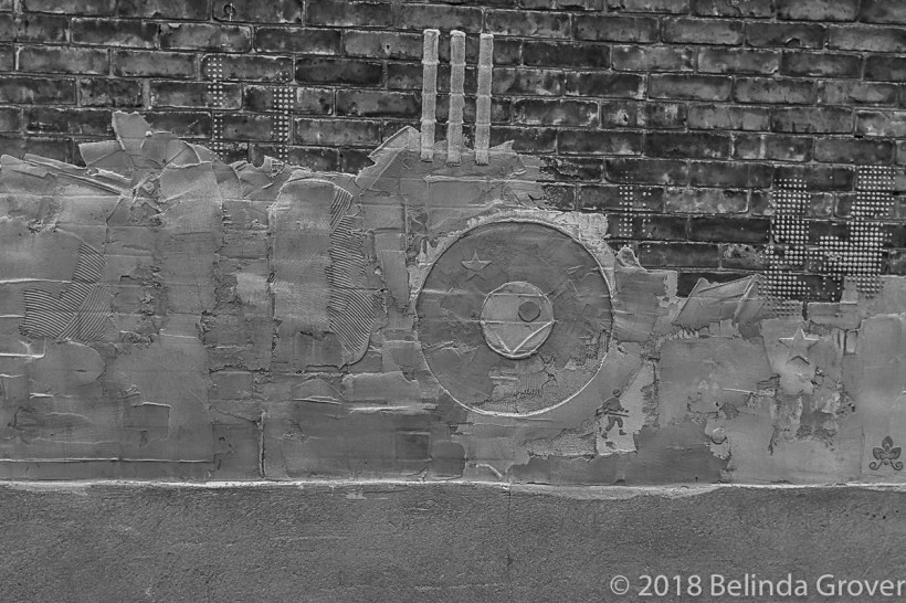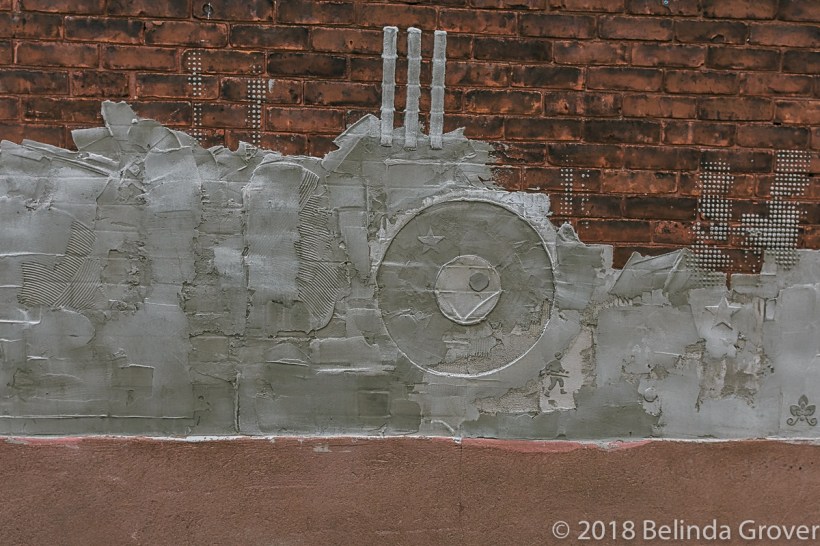 Walking by this exterior wall I thought at first that someone had decided not to finish up the plastering. On giving it a second look I saw a skyline emerging from the surface. I’ll have to return to photograph the rest of the wall as the story continues along the brick. A hidden gem in an older part of town.