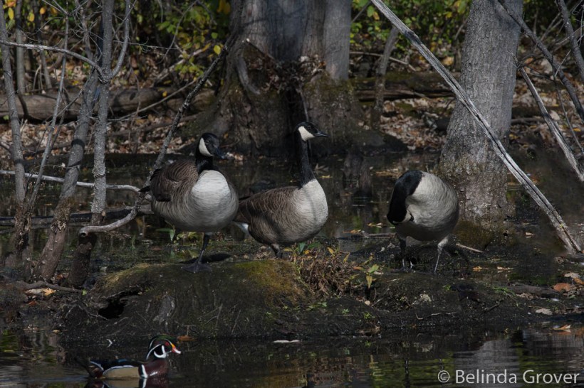 Peaceful Canada Geese photo-bombed by a cheeky Wood Duck!