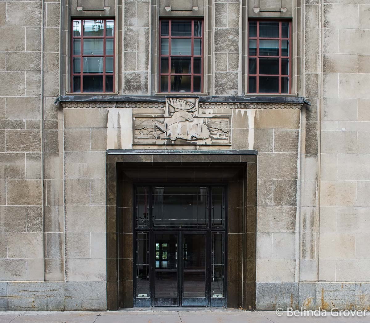One of several entrances to The East Memorial Building, a federal government office building, with federal heritage status, in Ottawa, Canada. Its construction began in 1950, and it is an example of Classical-Moderne design. Like many of the older federal buildings, it has a wonderful bas-relief over the doorway.