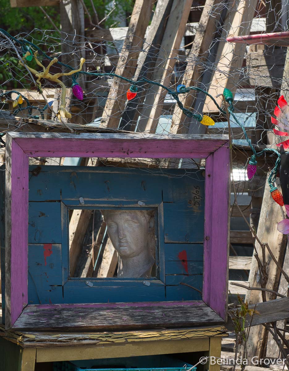 The front yard of this house has a collection of objects that the owner has acquired over the years and no two are alike. You just have to stand on the curb and point your camera in the direction of the yard. I thought this bust with a frame placed in front of it was rather curious π .