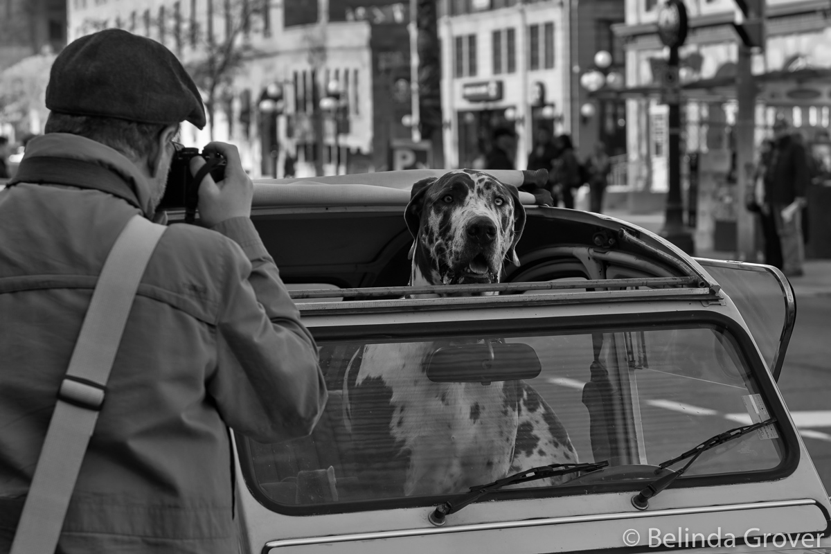 The dog’s owner had run into a store and left his Great Dane in the car. The huge dog in the tiny car drew a lot of attention and I had to wonder how the owner managed to drive with him on board.