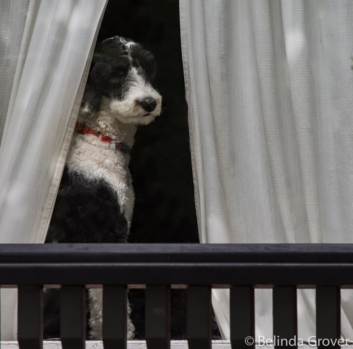 I often spot a cat in the window as I walk by a house.In this case, a dog was watching as its owners drove away in thecar. He took a moment to look in my direction too.