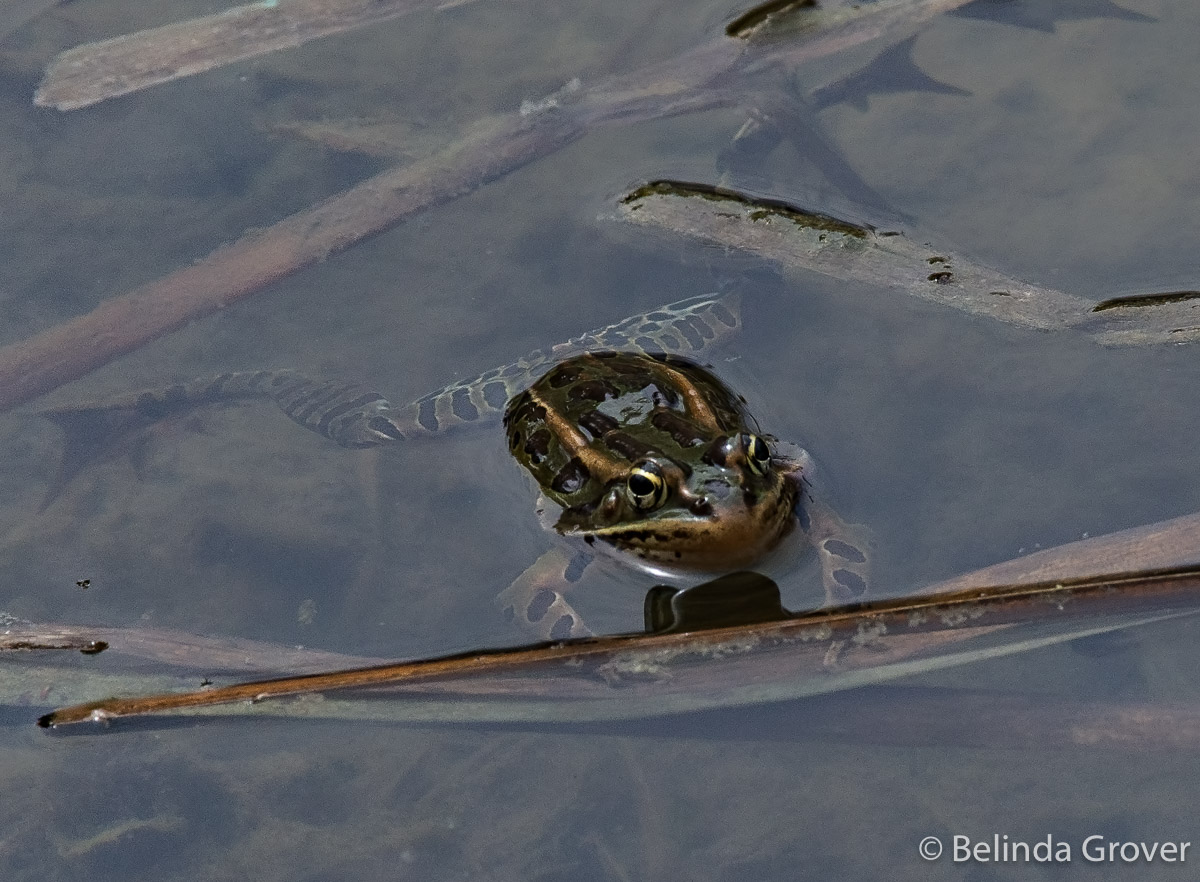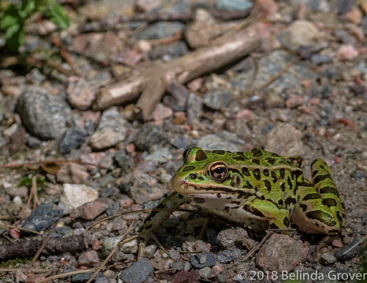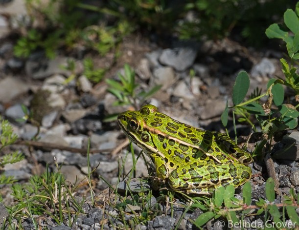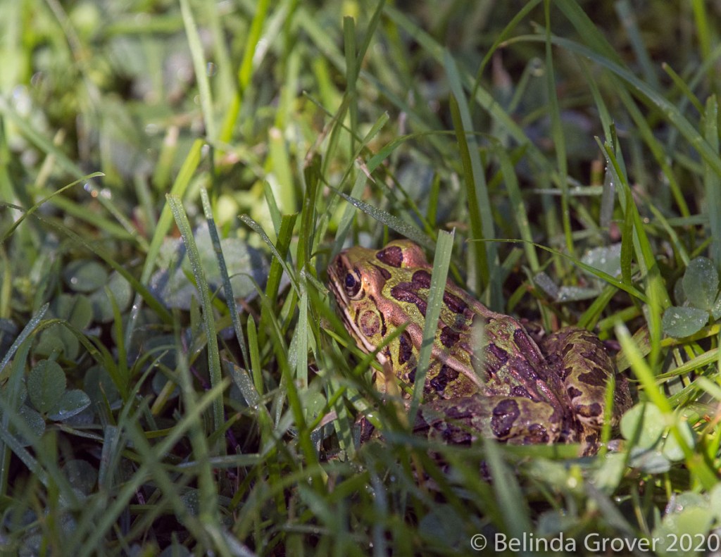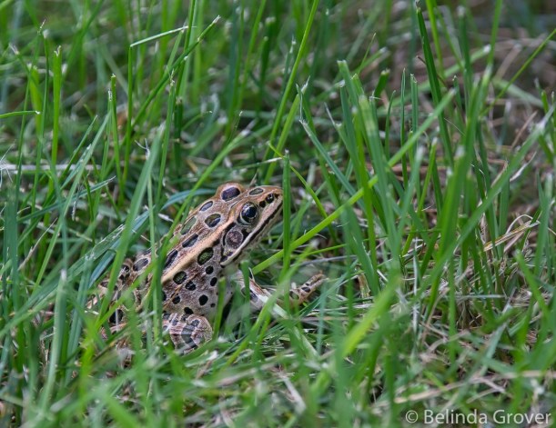 This is one of only a few frogs Iâve seen this summer, a handsome leopard frog. He stayed in the same position for the longest time, I hoped he would move forward a bit so I could get all of him in the shot. I waited for a while and finally gave up and continued my walk. As we were leaving the garden, I checked to see whether he had moved on. He hadnât budged at all. I guess he was enjoying the day his way!
