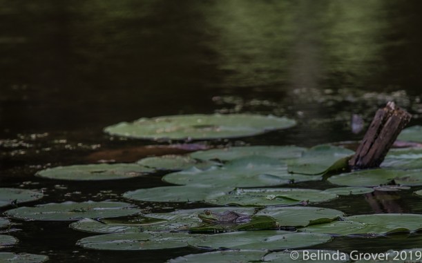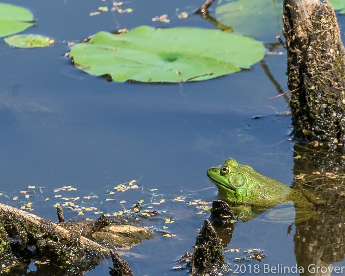 These photographs were taken in August when the lake was brimming with frogs. With the cooler weather here, we havenât seen any in weeks and I think thatâs probably it for the year. When I came upon this frog, I had to laugh. He was right up against this tree stump and it looked like he was taking the measure of the obstacle up ahead. I continued on my walk and when I returned to check on him an hour later, he was no longer there. I did see a frog on a lily pad on the other side of the stump and wondered if it was the same frog. If it was, did it go up and over or take a detour?