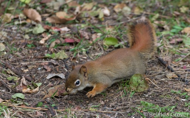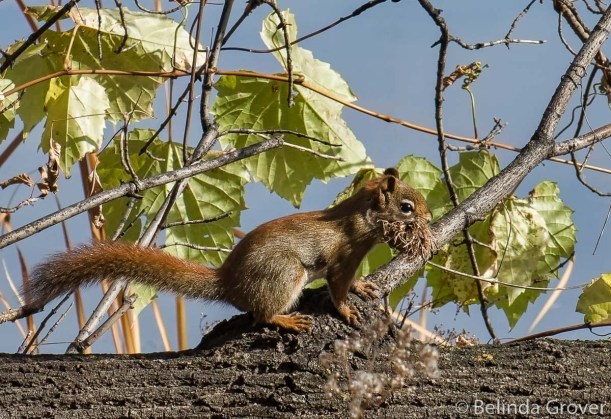 Fall is a busy time for squirrels as they prepare for the approach of winter.It looked like this red squirrel was gathering nesting material for its winter accommodation.