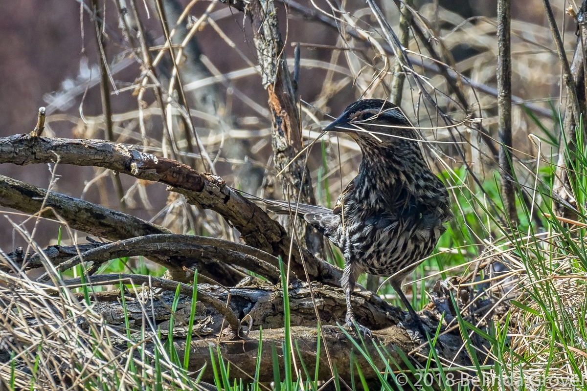 The first time I photographed a female red winged blackbird I wasn’t sure what I was looking at. The female is so unlike the male in appearance. They are quieter too, often in the underbrush gathering nesting material as this bird was. They do blend in quite well so I was pleased to have taken this shot.