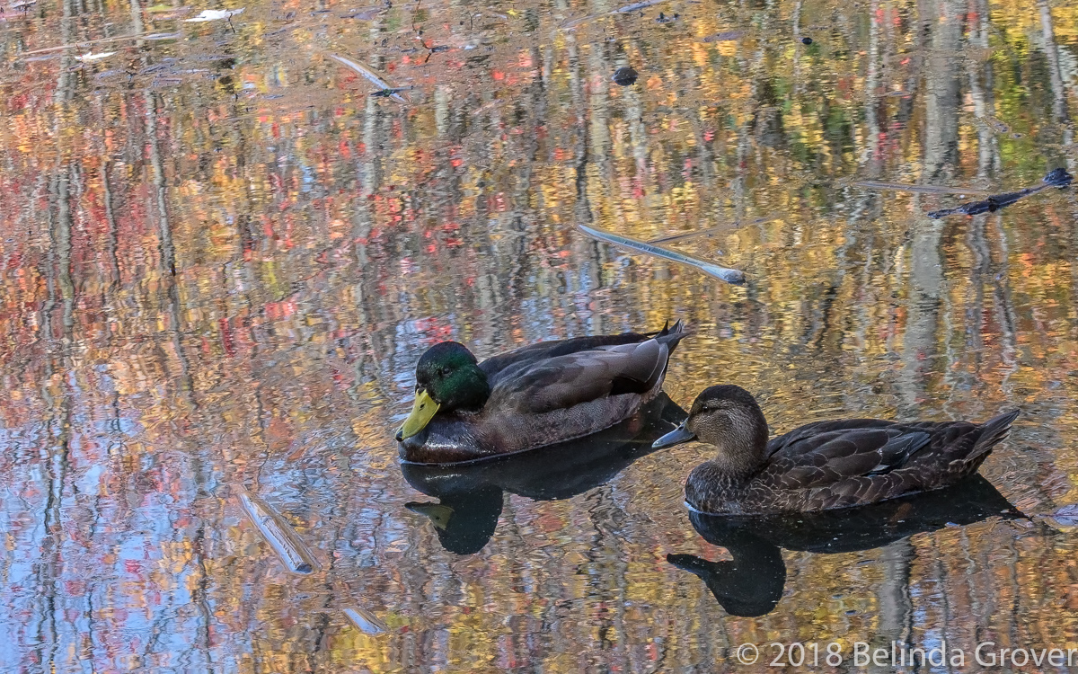 These photos were taken in October at different locations. The first by the river’s edge with low lying vegetation, the second photo of the mallard and his American black duck friend in a forest setting. In the first there is no mistaking the subject, in the second I believe the ducks share the stage with the brilliant fall reflections.