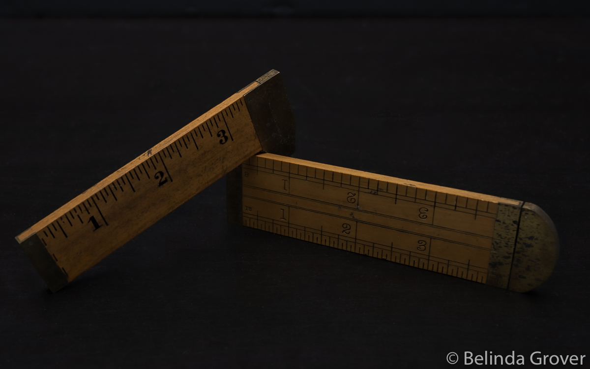 These old boxwood rulers with brass fittings were used to measure bolts of cloth and date back decades. Along with the bright yellow measuring tape, the rulers form the subjects of my second studio series.