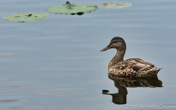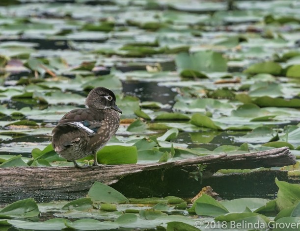 I enjoy photographing a lone duck, taking a break from the noisy group. This lake has many fallen trees that the ducks and geese take advantage of for just such a purpose. It was a good year for water lilies and their leaves provide a pleasing backdrop for the shot.