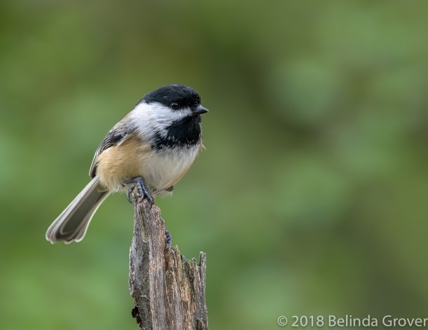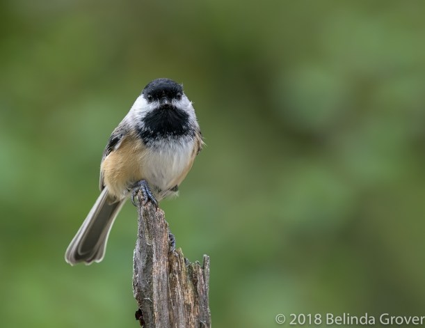 This chickadee was completely in the open and happy to remain so for a few minutes. There was a good distance between the bird and the trees which made for an attractive background. However, judging by the bird’s expression in the second photo, perhaps there was not enough distance between him and me!
