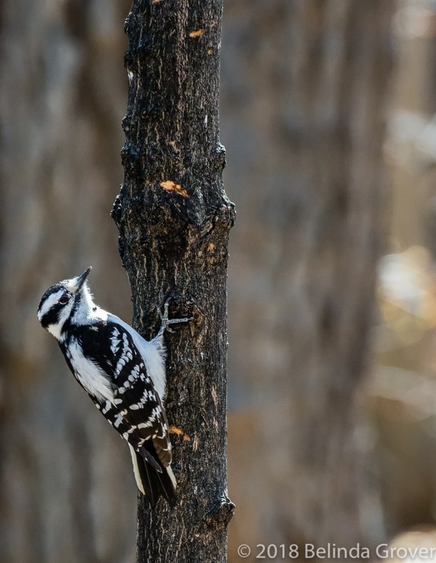 I heard her before I saw this downy woodpecker. She was drilling away for insects as I was walking by. As is often the case, you will hear a bird before you see it. Unlike her male counterpart which has a small red cap, the female downy does not but other than that they look pretty much alike.