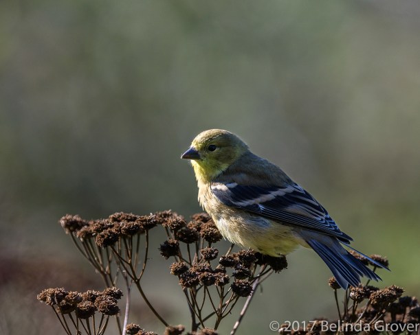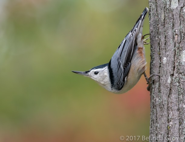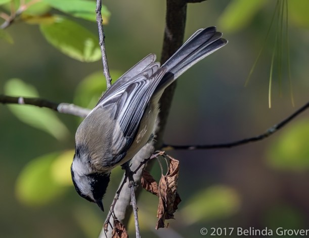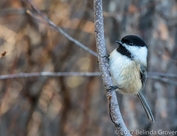 Both of these photos were taken at a narrow enough depth of field to get out of focus backgrounds. The first shot taken in late summer, has the bird showing off its acrobatic talent. The second chickadee was shot in the fall when most of the trees had shed their leaves but enough of them remained to create this amber effect. Always nice when the background complements the subject.