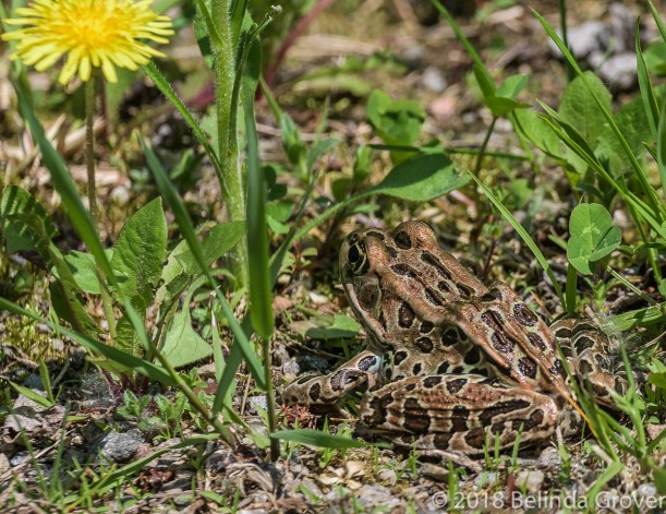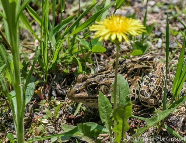 I wouldn’t have noticed this leopard frog if I hadn’t been looking in its general direction. Perhaps my footsteps startled him and he leapt for cover under the dandelion. These frogs are so well camouflaged that I wonder how many I may have overlooked so far this spring, this being my first sighting.