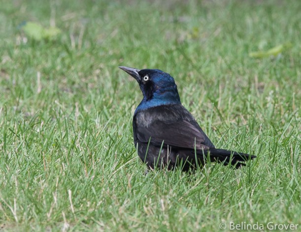 I usually see grackles near water or in trees, so I was surprised to see this bird walking along in the grass. I know people with bird feeders tend to dislike grackles as they will bully the other birds. I like them though and admire their keen eye and good looks (they also keep the insect population down).