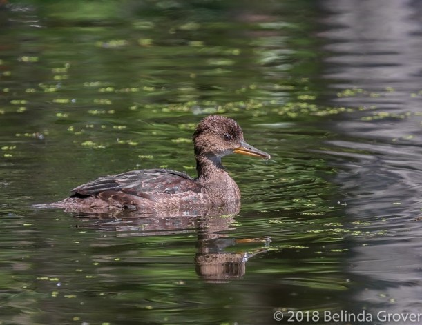 This female merganser stood out among the other ducks on the lake. She seemed to be the lone merganser swimming alongside the mallards and wood ducks. She didn’t display her crest and with no mate nearby I thought she looked like a young one. Hooded Mergansers are small ducks and are divers not dabblers. Although we didn’t see her catch anything while we watched her, she certainly was trying.