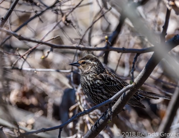 Red-winged blackbirds are among the earliest migrants to return in the spring. We see the males first and often hear their song before we spot them. The females are often found further into the woods gathering nesting material. Their colouring is more subtle than the males but just as beautiful I believe.