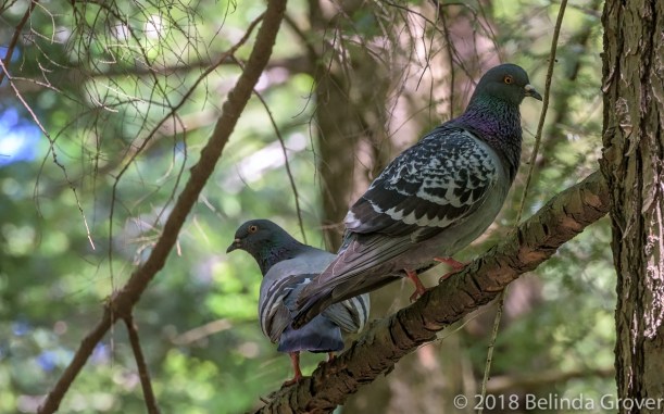 Rock Dove is another name for this bird, that most of us call the common pigeon. You see them all over the city, but we were in the country, in the woods, which made their sighting more unusual. They were the only two pigeons around, so perhaps they were a breeding pair. I had the time to really look at them as they perched in this natural setting and found them attractive, not a quality I usually attribute to this breed. More dove than pigeon these two.