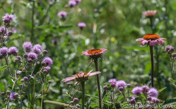 Two more wildflowers that I look forward to seeing each summer. The flower in the first photo gets it’s name from the pistils in the middle of the flower which develop into heads of seeds with long fuzzy hairs. They look like smoke. The vibrant yellow of the sunflower attracts me as it did the bee. Like many other areas this summer, we are experiencing drought-like conditions, you may notice the heat stress on the flower’s leaves.