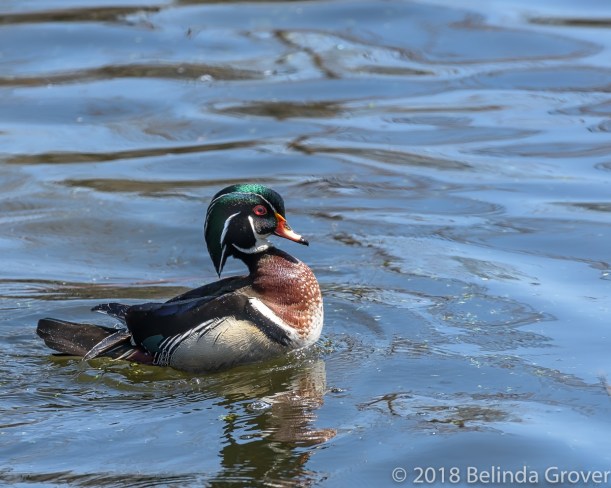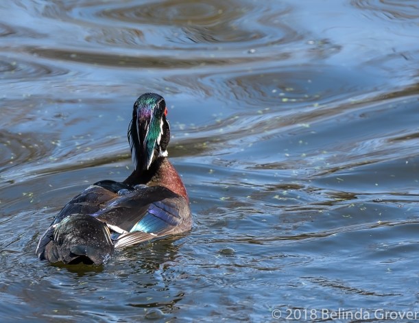 This back view of the wood duck made me think of the ducktail, a haircut that was popular in the 50s. You don’t necessarily have to get your subject face on to get a decent shot. I liked the duck’s puffed up chest in the second photo too, as if his “do” wasn’t enough to impress the ladies😊.